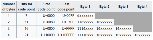 - UTF-8 : 문자를 최소 1 부터 최대 4 바이트로 표현한다. (즉 문자마다 길이가 다르다!)