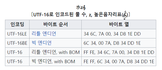 - UTF-16 : 문자를 2 혹은 4 바이트로 표현한다.