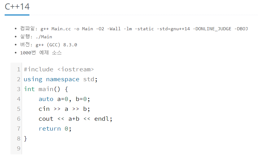 다음은 백준 온라인 저지에서 C++ 소스 코드를 C++ 14로 컴파일 하는 정보입니다.