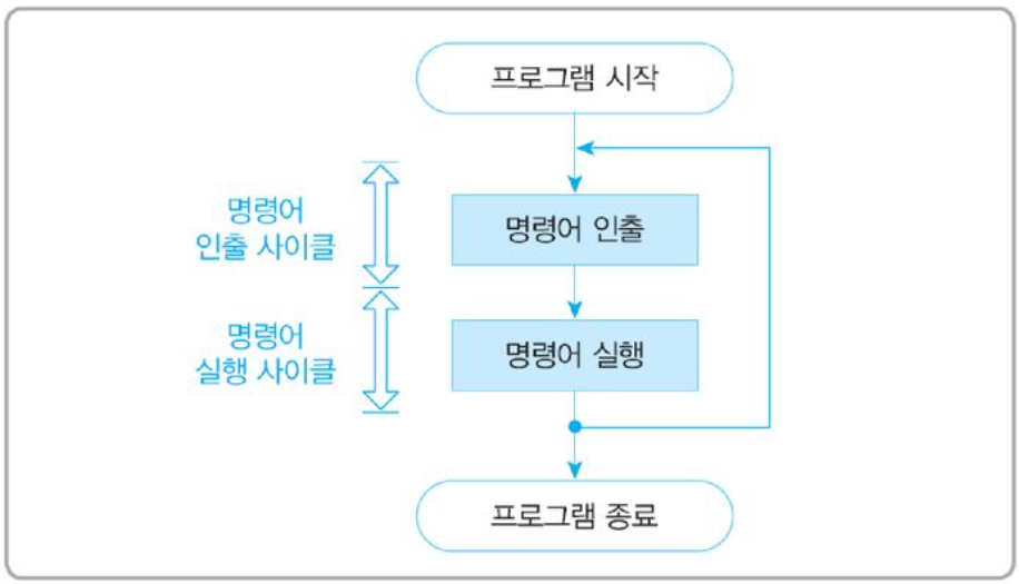 마이크로프로세서(CPU)가 메모리로부터 프로그램 된 한개의 기계어 명령어를 가져와 어떠한 동작을 요구하는지를 결정하고 명령어가 요구하는 동작을 수행하는 연속적인 동작 과정이다.