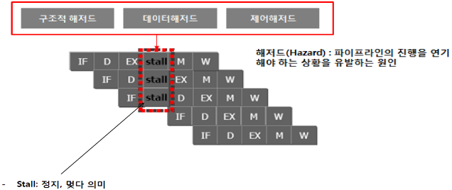 명령어 실행 지속이 불가하여 지정된 클럭에서 수행되는 파이프라인이 지연, 중지되는 현상