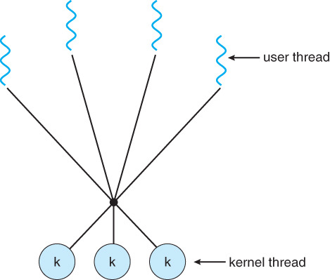 하나의 커널 스레드에 여러개의 사용자 스레드가 매핑되는 형태이다.